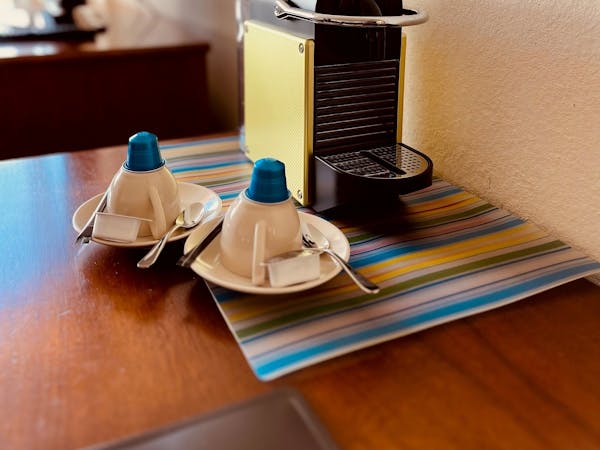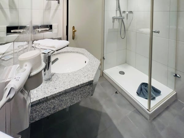 Our single room offers a private balcony with a view of the surrounding nature. It has a modern bathroom, a functional workstation, a spacious wardrobe, a flat-screen TV and a refrigerator. As our guest, you also have access to the hotel's own pool and sun terrace. Perfect for a relaxing and productive stay.
