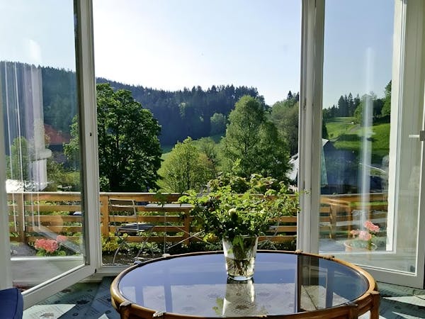 Our double room offers you everything you need for a relaxing stay. Enjoy hours of sunshine on the balcony with an impressive view of the nature of the Black Forest. The room has a modern bathroom and a cosy sitting area, ideal for relaxing. Other amenities include a refrigerator and a flat-screen TV.